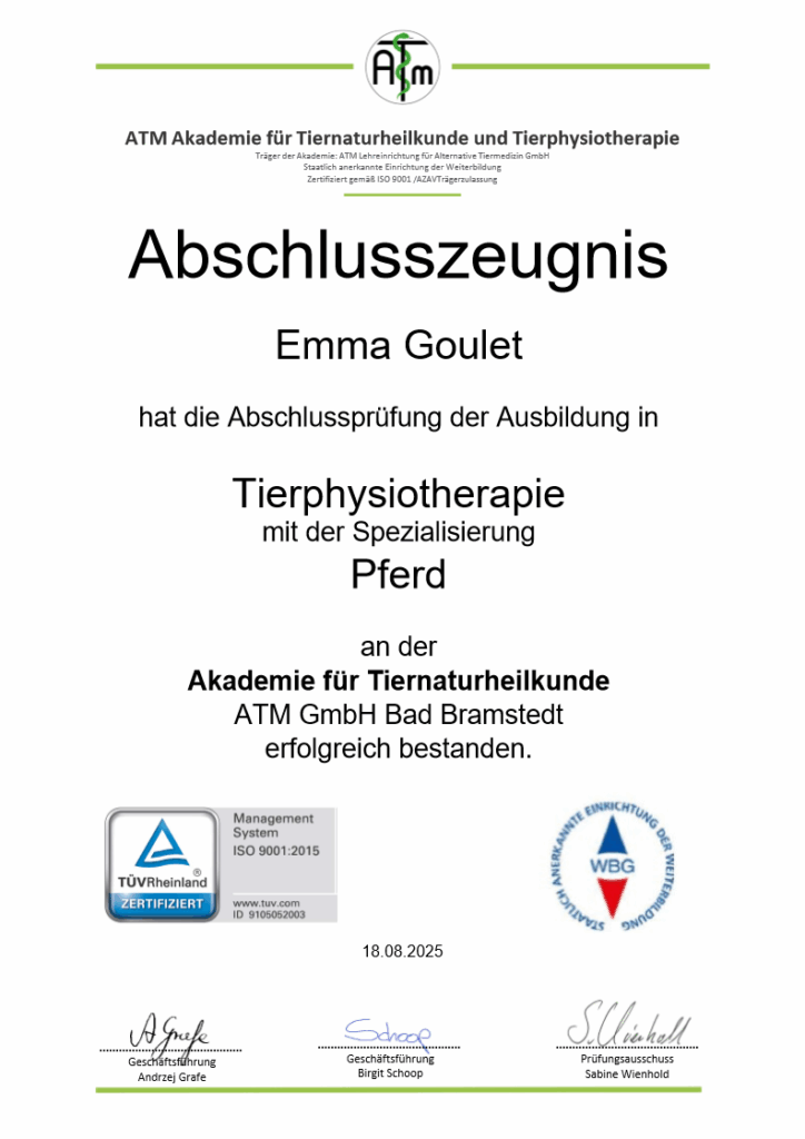 - Abschluss Pferdephysiotherapie an der ATM (Akademie für Tierheilkunde) im August 2025