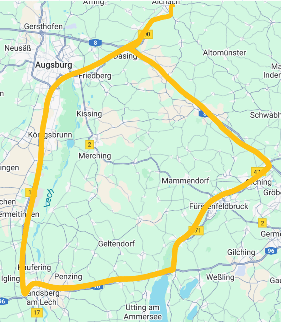 Dienstags bin ich immer entlang der A8, um den Wörthsee, nörlich um den Ammersee und um Landsberg am Lech unterwegs. Die Karte zeigt die grobe Route.